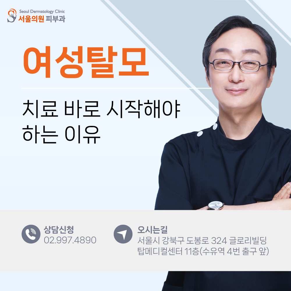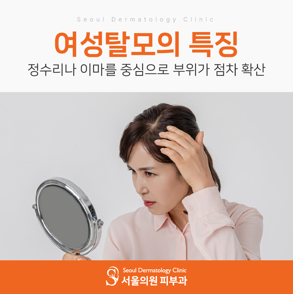 남성분들의 유형과 다르게 전반적으로 머리카락이 얇아지면서 탈모가 발생하는 양상을 보이는 것이 특징인데요.