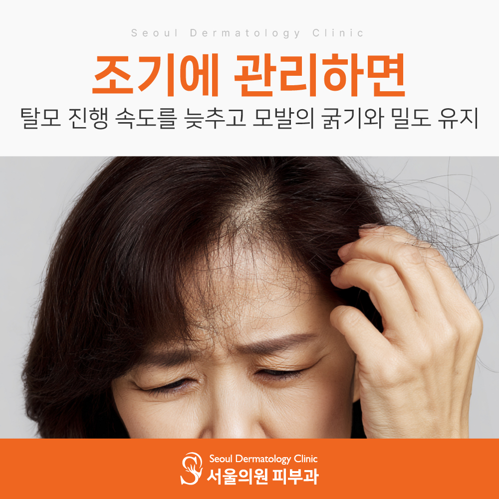 조기에 관리하면 탈모 진행 속도를 늦추고, 모발의 굵기와 밀도를 유지하는 데 긍정적인 영향을 줄 수 있습니다. 증상이 시작되었을 때 이를 방치하지 않고 생활습관 개선과 함께 상태에 맞는 방법을 병행한다면, 외모 변화와 자신감 저하를 모두 예방할 수 있습니다.