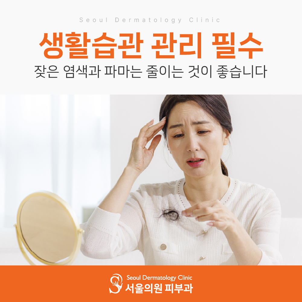 모발 상태를 지키기 위해서는 생활습관 관리가 필수적입니다. 잦은 염색과 파마, 강한 스타일링 제품 사용은 두피에 부담을 주고 모발을 약하게 만들 수 있으므로 줄이는 것이 좋습니다. 또한 모자를 장시간 착용하거나 두피를 조이는 모발 스타일은 혈류를 방해해 모발 성장에 악영향을 줄 수 있습니다.