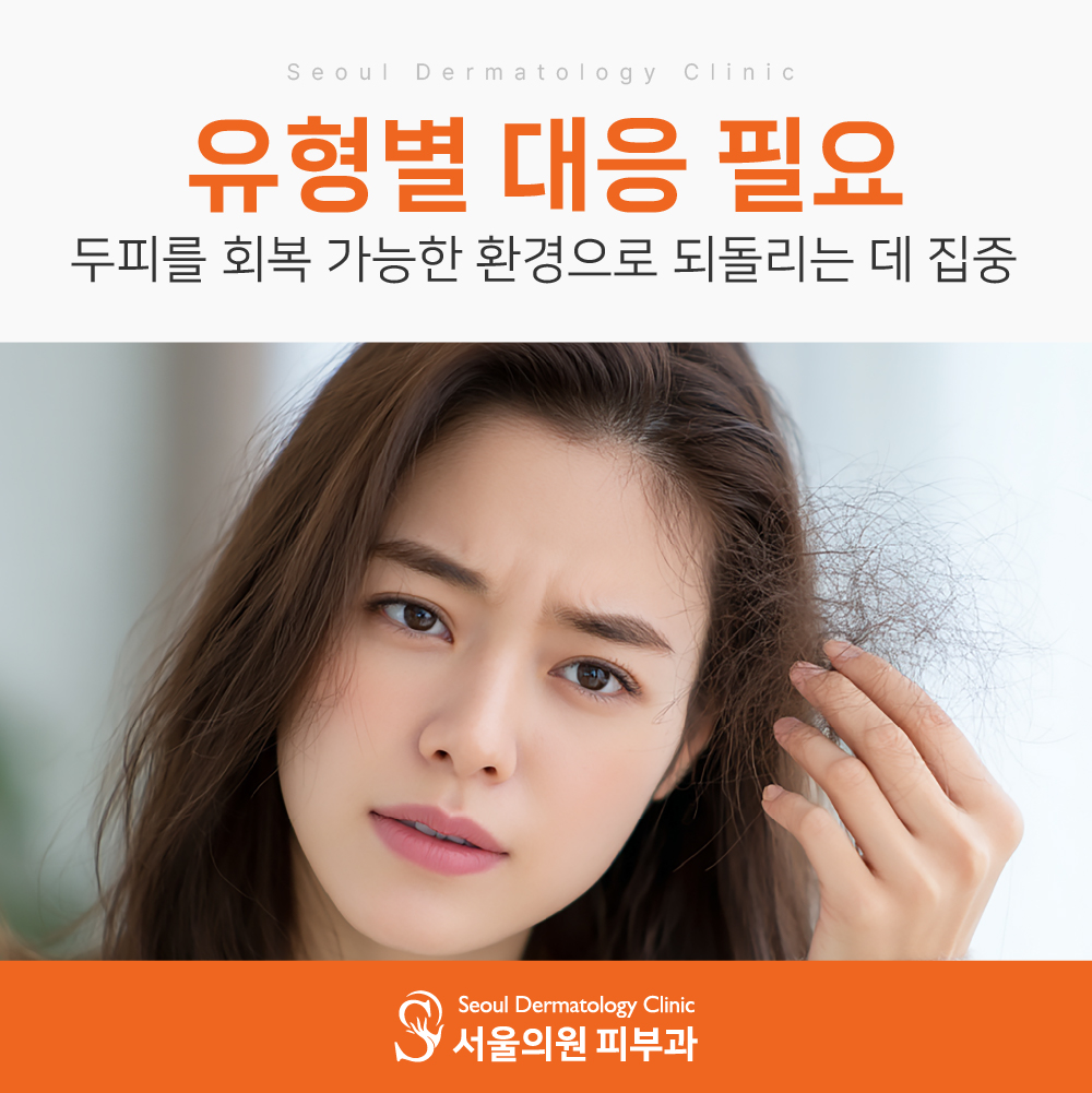 예컨대 ‘휴지기 탈모’는 스트레스나 출산 후 일시적으로 발생하며 시간이 지나면 회복될 수 있지만, ‘견인성 탈모’는 잦은 포니테일, 헤어롤, 헤어 익스텐션 등 물리적 자극에 의해 발생하므로 습관의 수정이 중요합니다. 반면 ‘만성 여성형 탈모’는 점진적으로 진행되며 꾸준한 두피 환경 개선과 자극 완화, 영양 보충이 필수입니다.