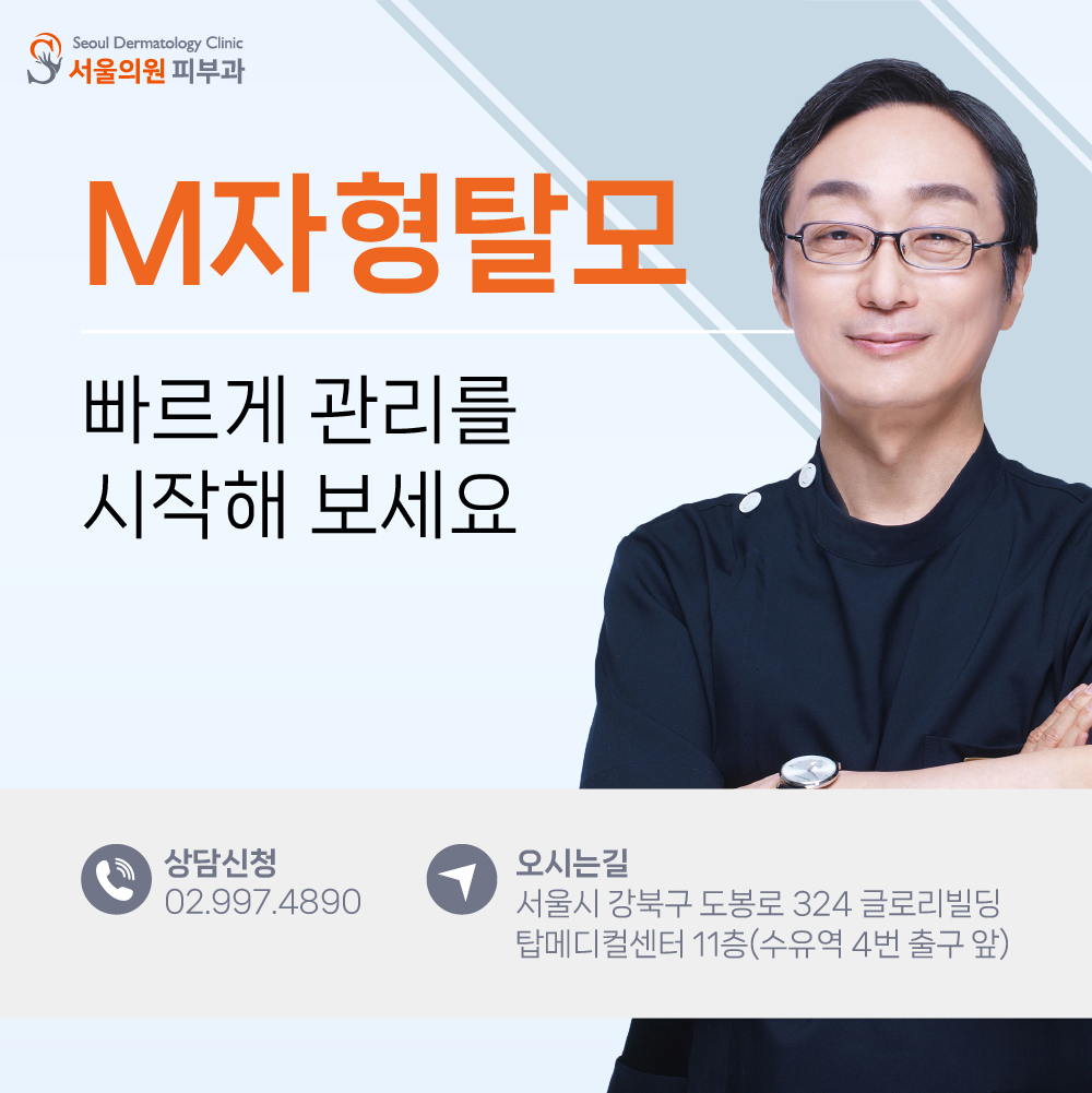 M자형탈모는 주로 남성분들에게 빈번히 나타나는 탈모의 유형 중 하나로, 이마의 양쪽이 점차 후퇴하면서 헤어라인이 영어의 알파벳 'M'자 형태로 변하는 것이 특징입니다.